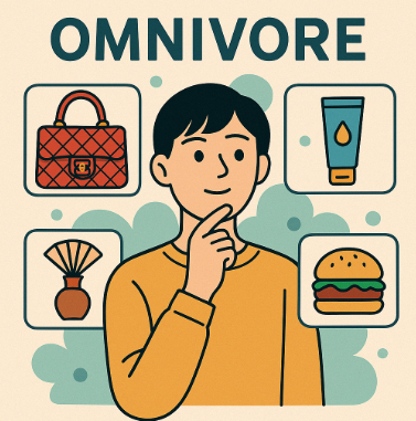 옴니보어란 말 그대로 '잡식성 소비자'를 뜻합니다. 특정 브랜드, 가격대, 국가, 카테고리 등에 얽매이지 않고 자신의 취향과 필요에 따라 다양하게 소비하는 형태입니다. 이들은 명품과 가성비 제품을 동시에 구매하며, 가치소비와 과시소비를 상황에 따라 유연하게 조합합니다. 이러한 배경에는 초개인화, 초연결 사회에서 다양한 콘텐츠와 정보를 접하며 소비자 주권이 강화된 시대적 흐름이 자리하고 있습니다.