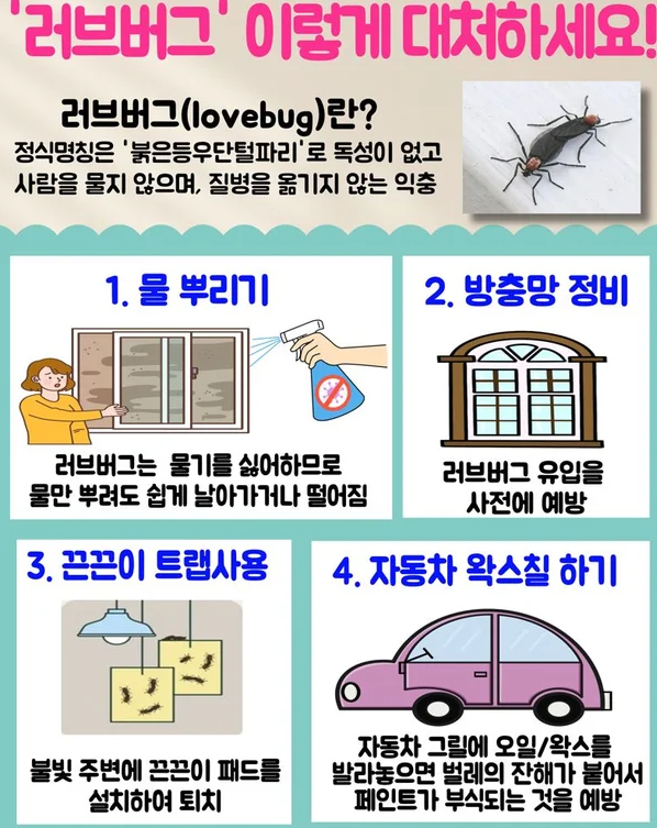 러브버그가 자동차에 미치는 피해는 매우 큽니다. 이 때문에 러브버그 시즌에는 다음과 같은 차량 관리법이 권장됩니다:
